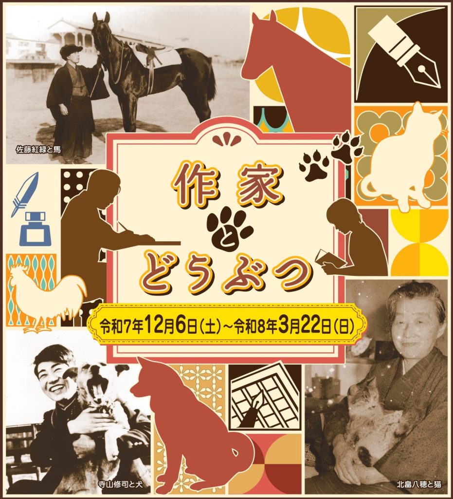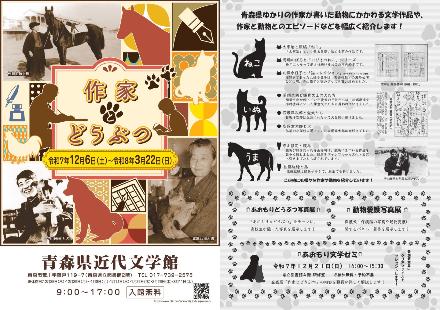 この企画展では、青森県ゆかりの作家が書いた動物にかかわる文学作品や、青森県ゆかりの作家と動物とのエピソードなどを幅広く紹介します。